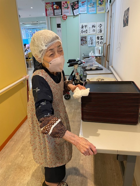 奉優デイサービス池尻で、食後のお盆拭きを自ら楽しみながら取り組むY様。