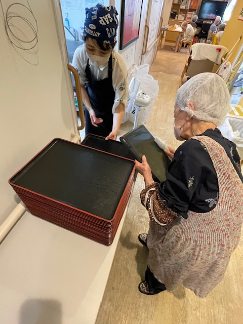 「お盆これだけー」と、厨房にいる職員に笑顔を見せながら声をかけるY様。