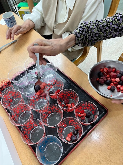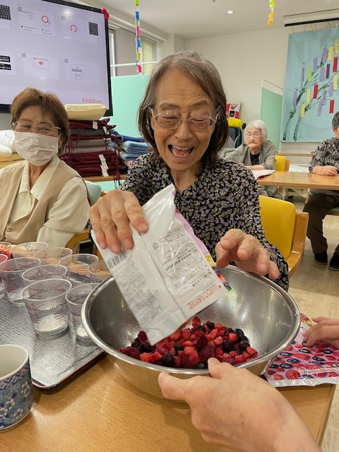 冷凍フルーツをボールに入れるF様は、本日からのご利用スタート。おやつ作りに