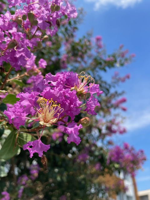 暑い1日の始まり、青い空に映えるピンク色の百日紅は涼しさを感じさせてくれます