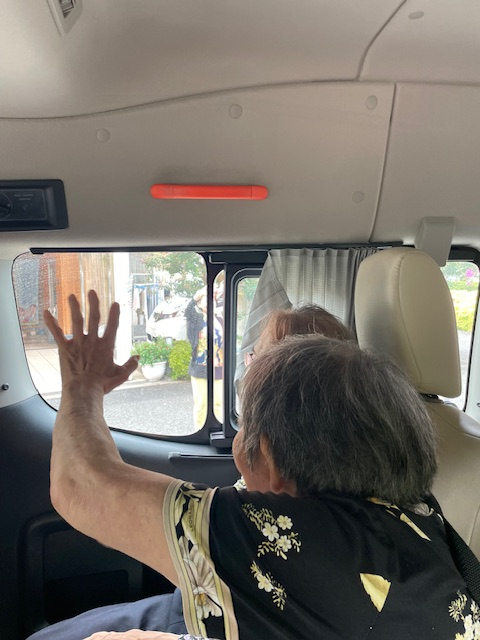 発車おーらい♪ お見送りの職員に元気に手を振るM様。