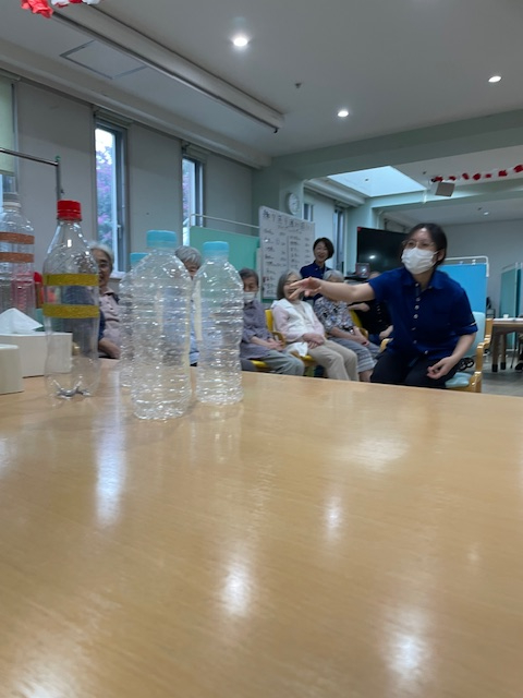 テーブルの上には、的となる大小のペットボトルが置かれています。