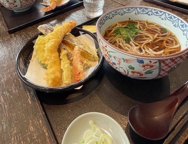 海老の天ぷらに、茄子やレンコン等の野菜の天ぷらに、温かいお蕎麦を頂きます。