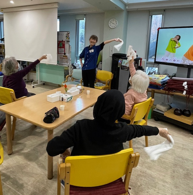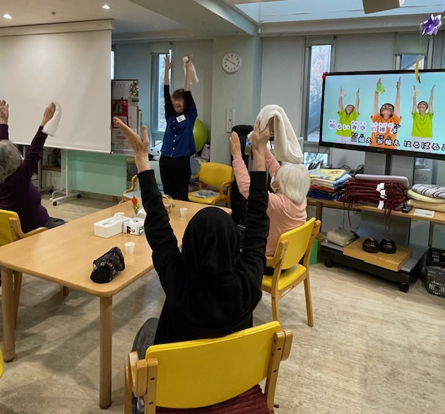 昔懐かしい「高原列車」の曲に合わせて、大きく肩と腕を動かしてもらいます。