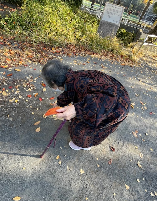 せっかくだからと、数枚の落ち葉を拾い手にし、自然と膝の屈伸運動が出来ているT様。