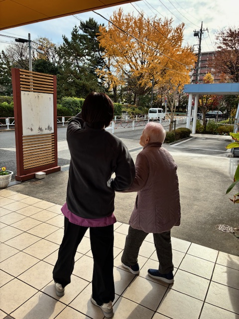 自らご利用者S様と一緒に、外気浴&気分転換&歩行機能維持を目的として