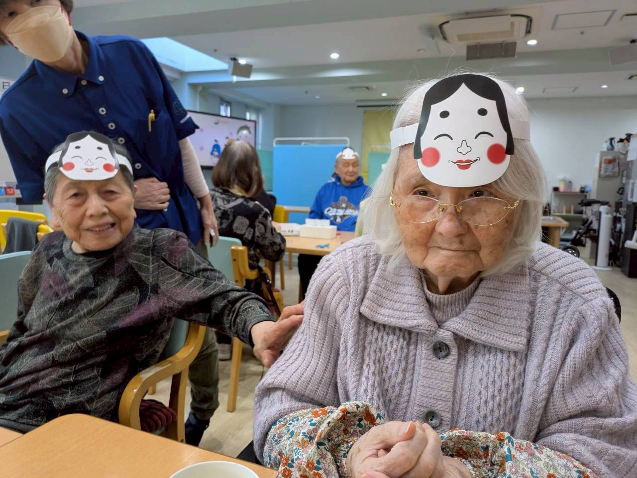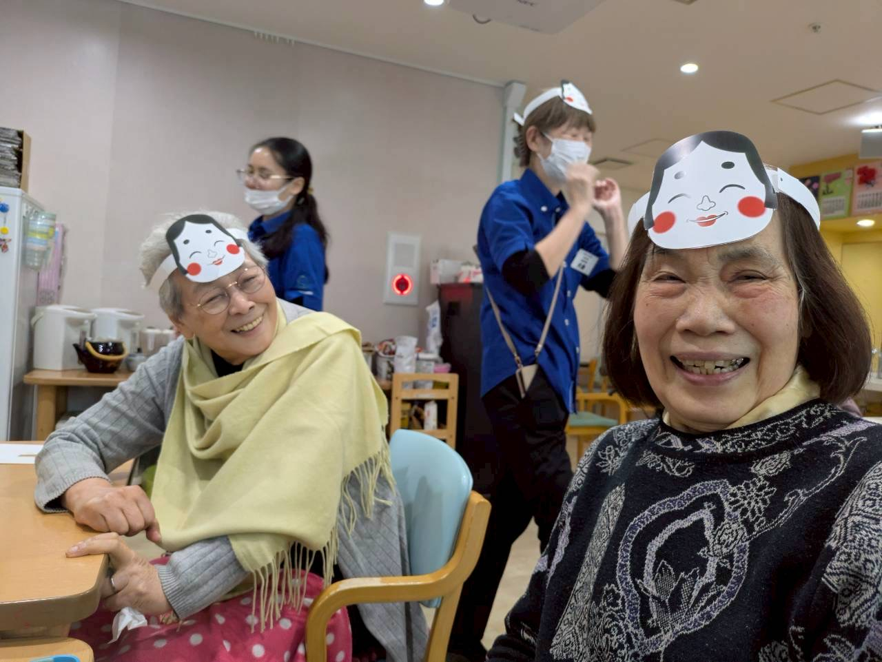 まずはご利用者様全員で被り物を被ります!容姿から節分を楽しみます!