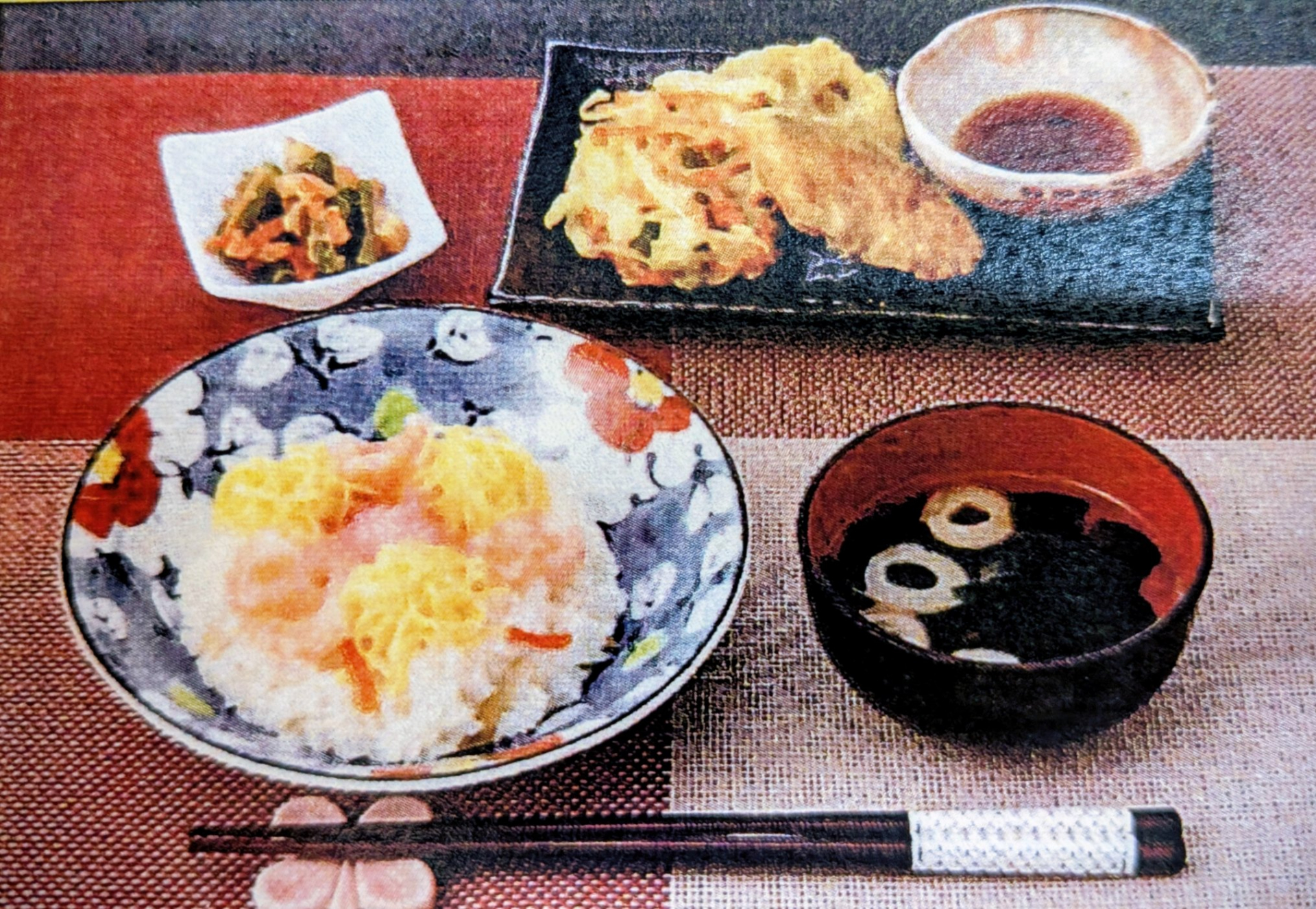花ちらし寿司定食(花ちらし寿司・野菜天婦羅・薩摩揚げとインゲンのピーナッツ和え・すまし汁)