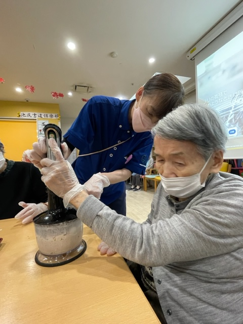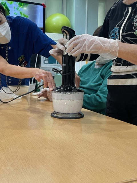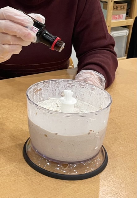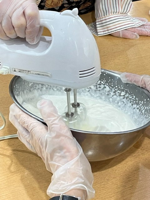 和栗は、職員が自宅から持参したミキサーに掛けて貰います。生クリームと佐藤・・・じゃなく砂糖。バニラエッセンスをたっぷりと入れて~美味しくなれと気持ちを込めて頑張るのはミキサー!!