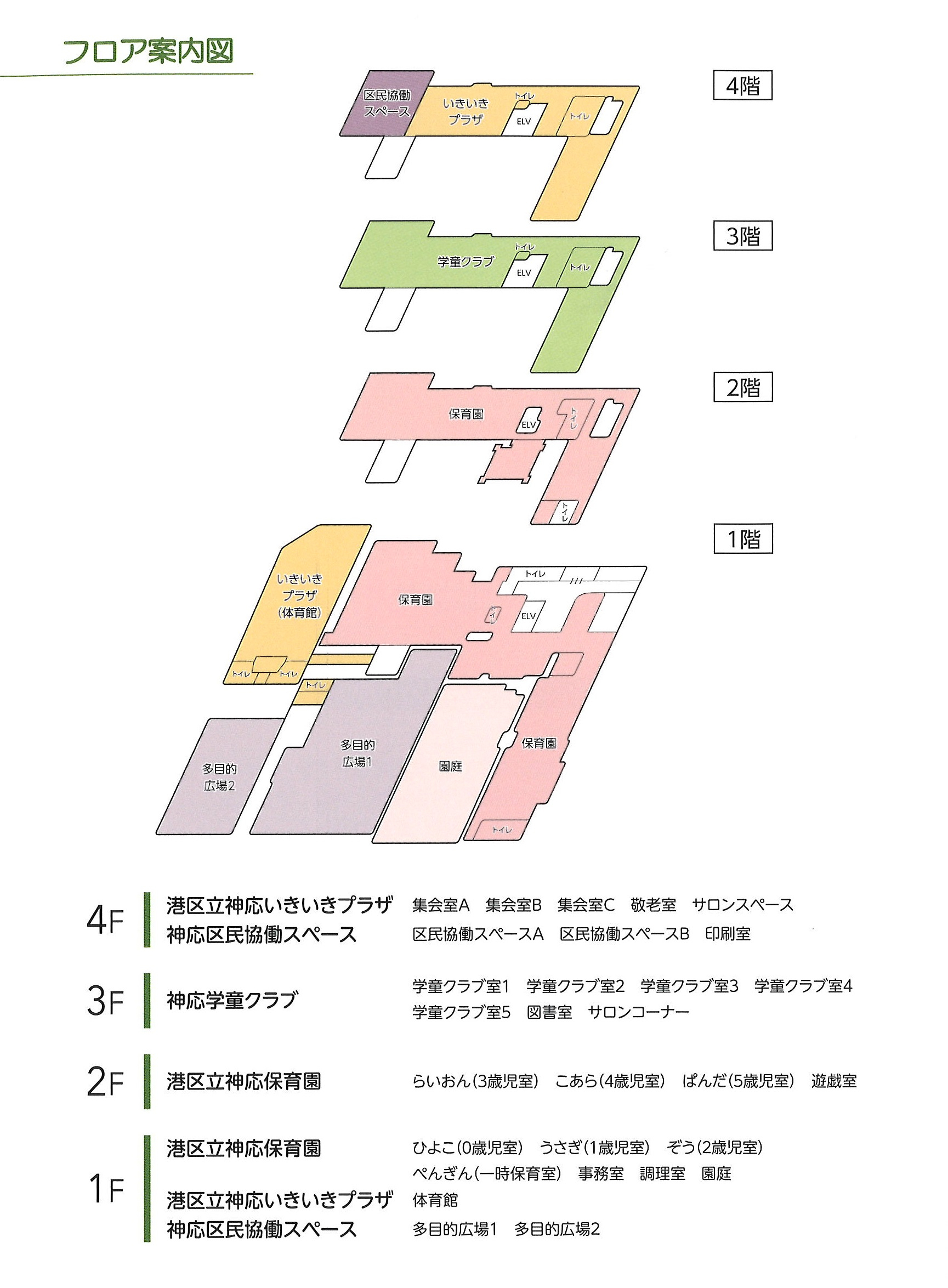 「神応いきいきプラザ」は旧神応小学校を活用した複合施設、「神応ほっとプラザ」内にあります。保育園・学童クラブ・区民協働スペースが併設しており、地域の高齢者や区民の方の世代を超えたコミュニティの場としてご利用いただけます。