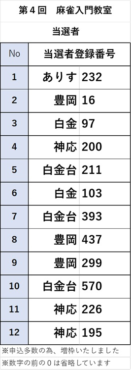 第4回 麻雀入門教室 当選者発表