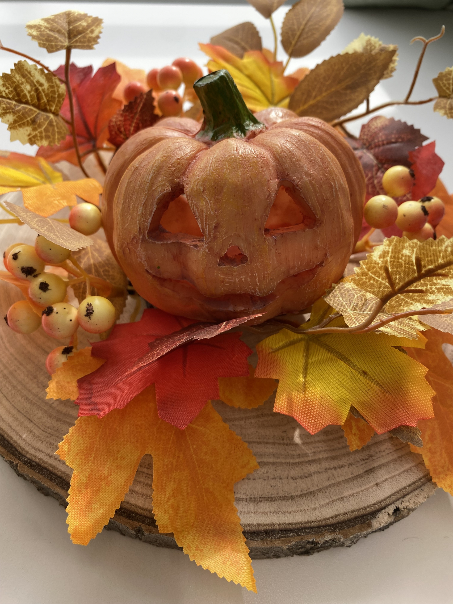 怖い顔のカボチャちょうちんを掘り玄関に置いて