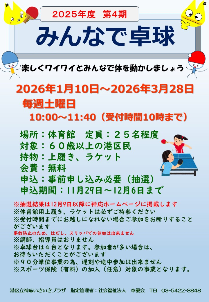 2025年度第4期(2026年1月~3月) みんなで卓球の参加者募集