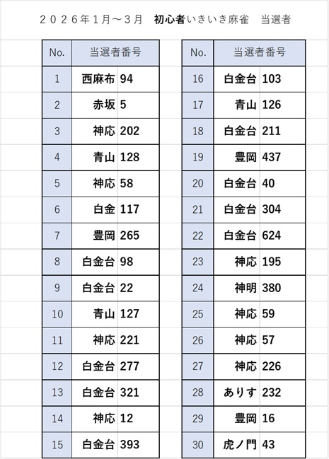 2026年1月~3月 神応いきいき麻雀 当選者発表