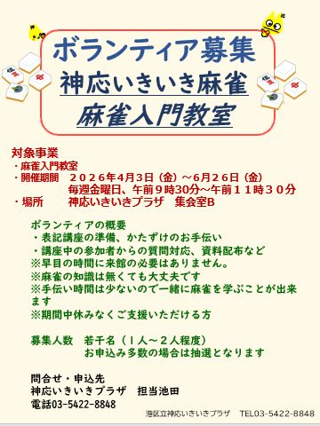 麻雀入門教室 ボランティア募集のお知らせ