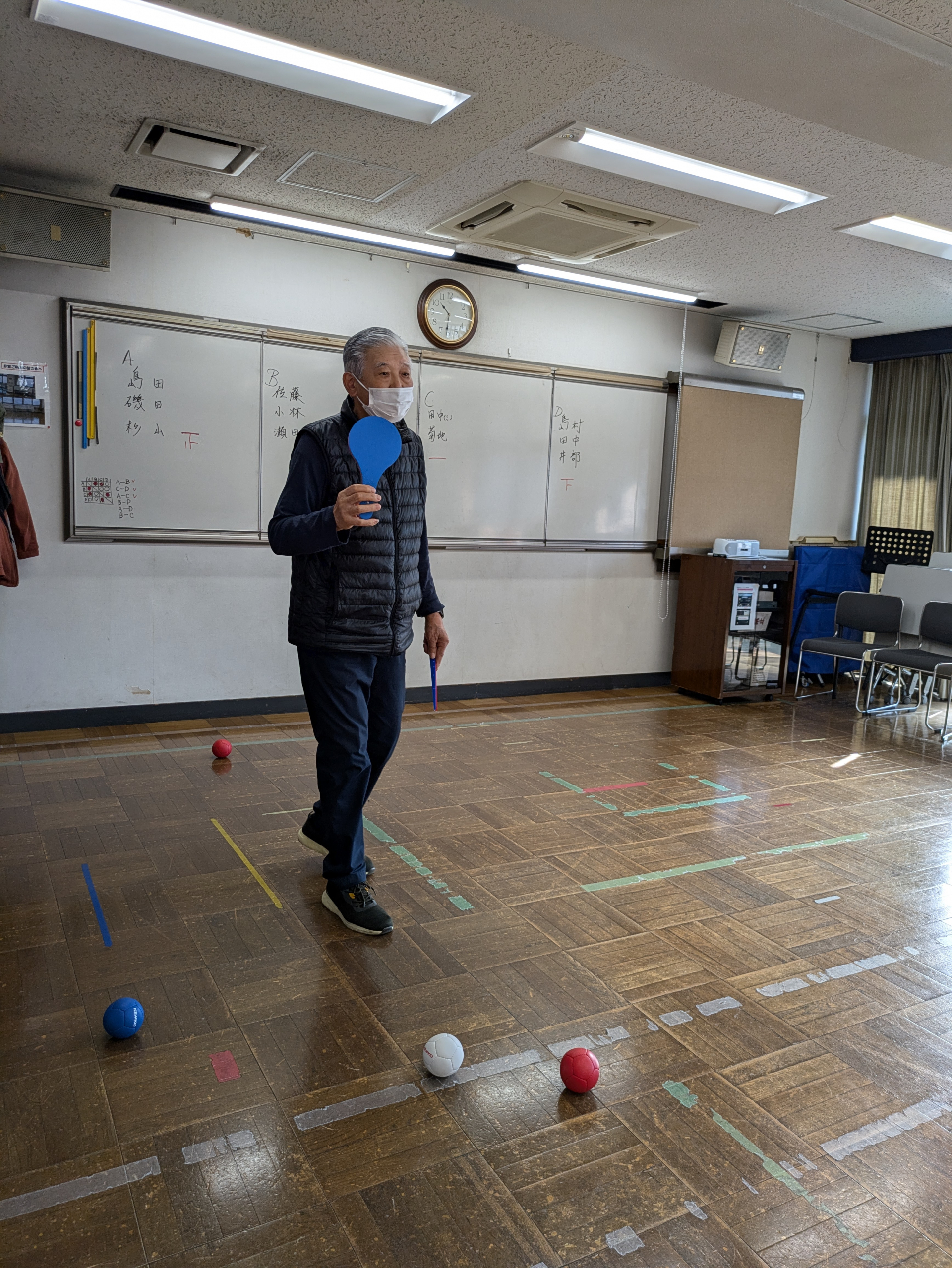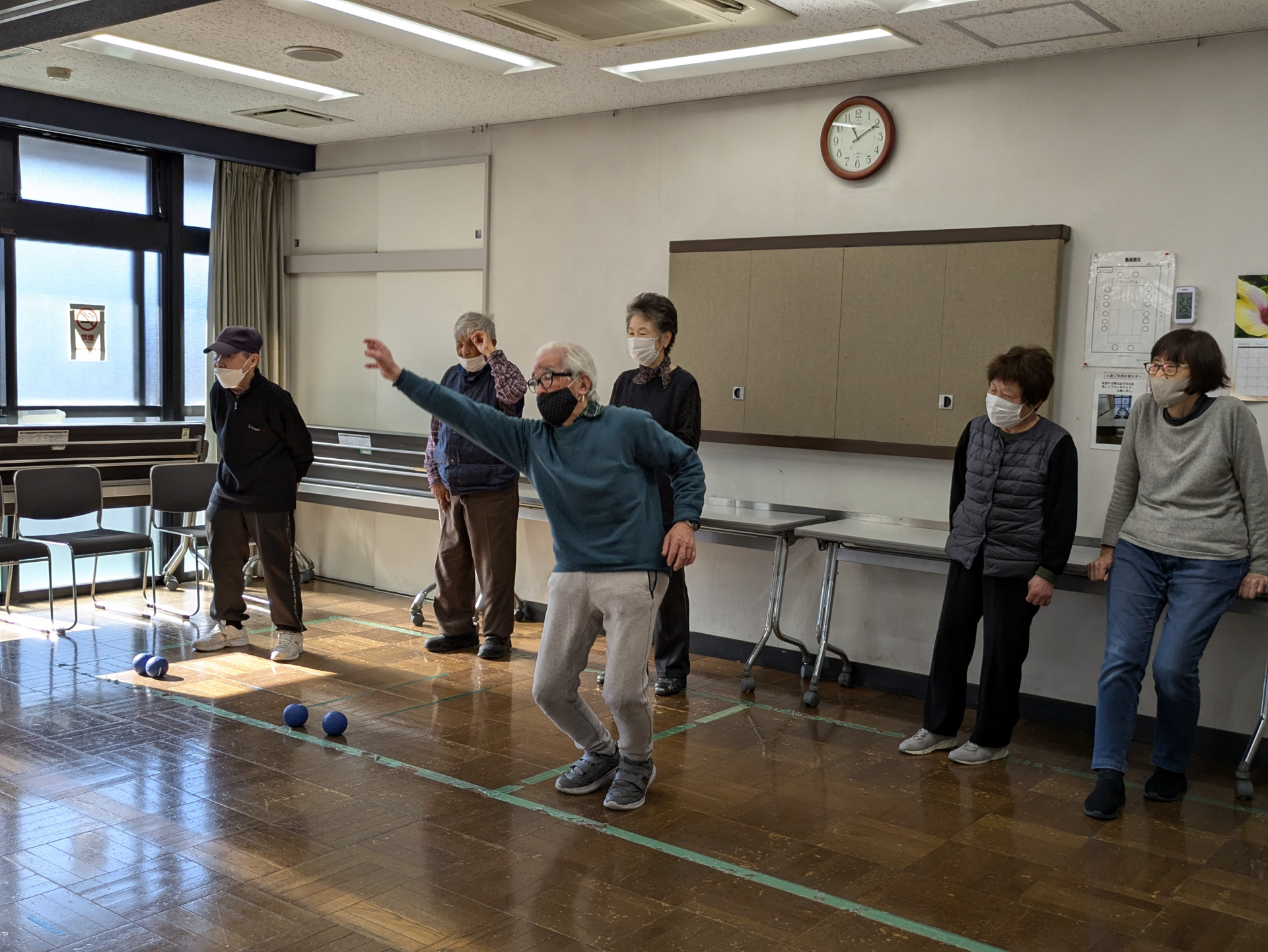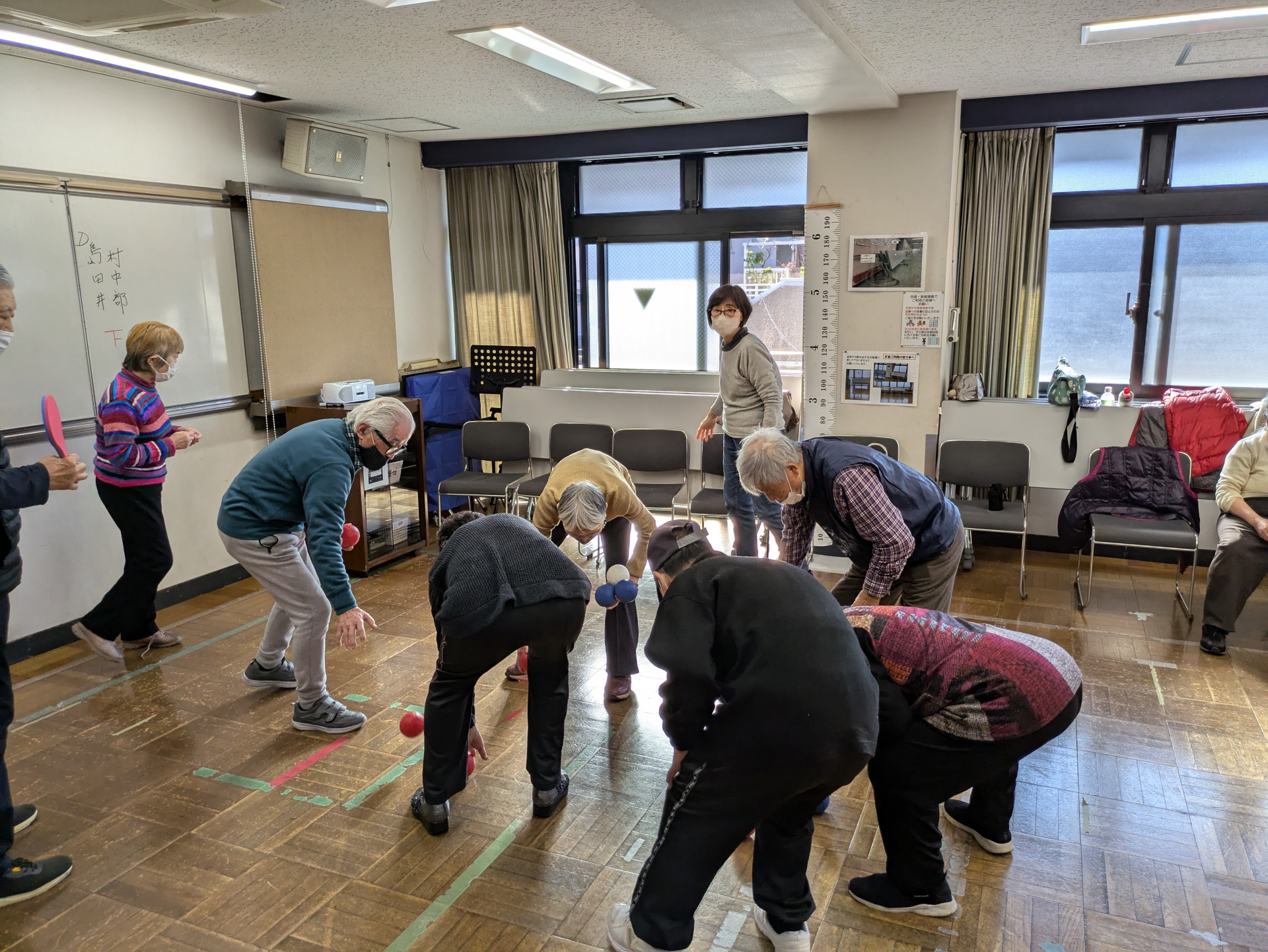 ジャッジ後の皆で玉拾いもひざの曲げ伸ばし運動になります。