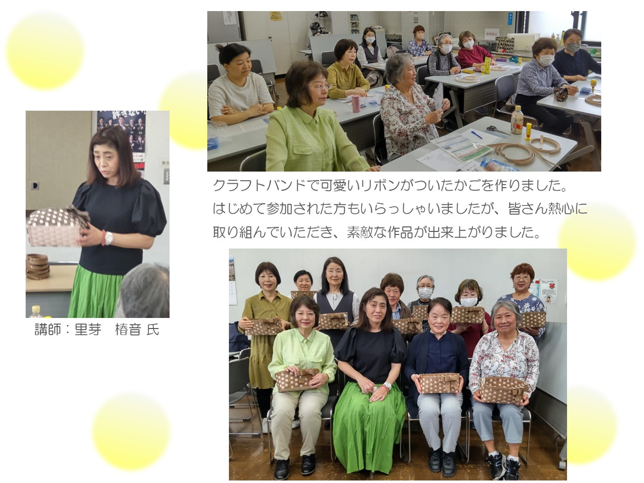 2025.04.18 活動報告 クラフトバンド教室 ~リボンのかご作り~ Tweet シェアする 前の記事 2025.04.19 活動報告 素敵に折り紙サロン 次の記事 2025.04.16 活動報告 まだまだ楽しめます♪🌼 一覧へ戻る