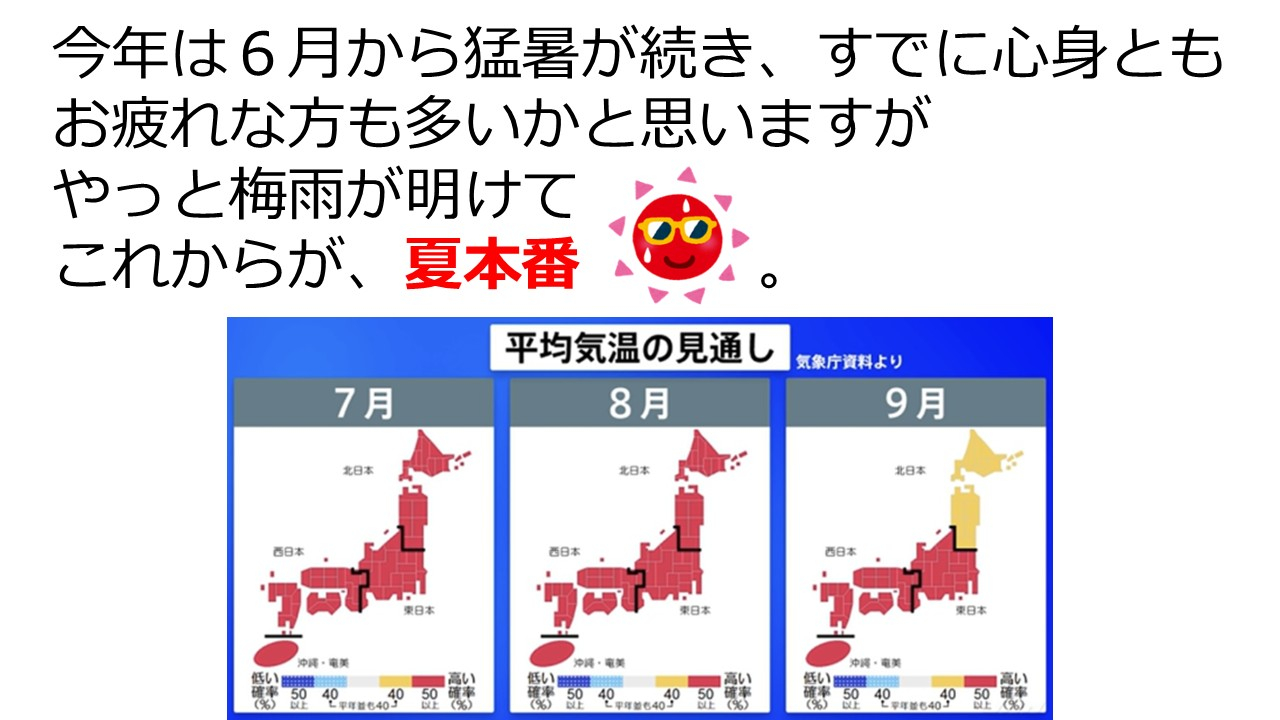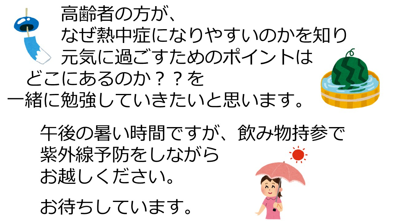 2025.07.21 お知らせ 梅雨が明けましたね! ~健康講座~ Tweet シェアする 前の記事 2025.07.26 お知らせ 手の運動に脳トレに折り紙教室 次の記事 2025.07.19 お知らせ ハンドメイド教室 クラフトバンドでかごバッグを作ろう 一覧へ戻る