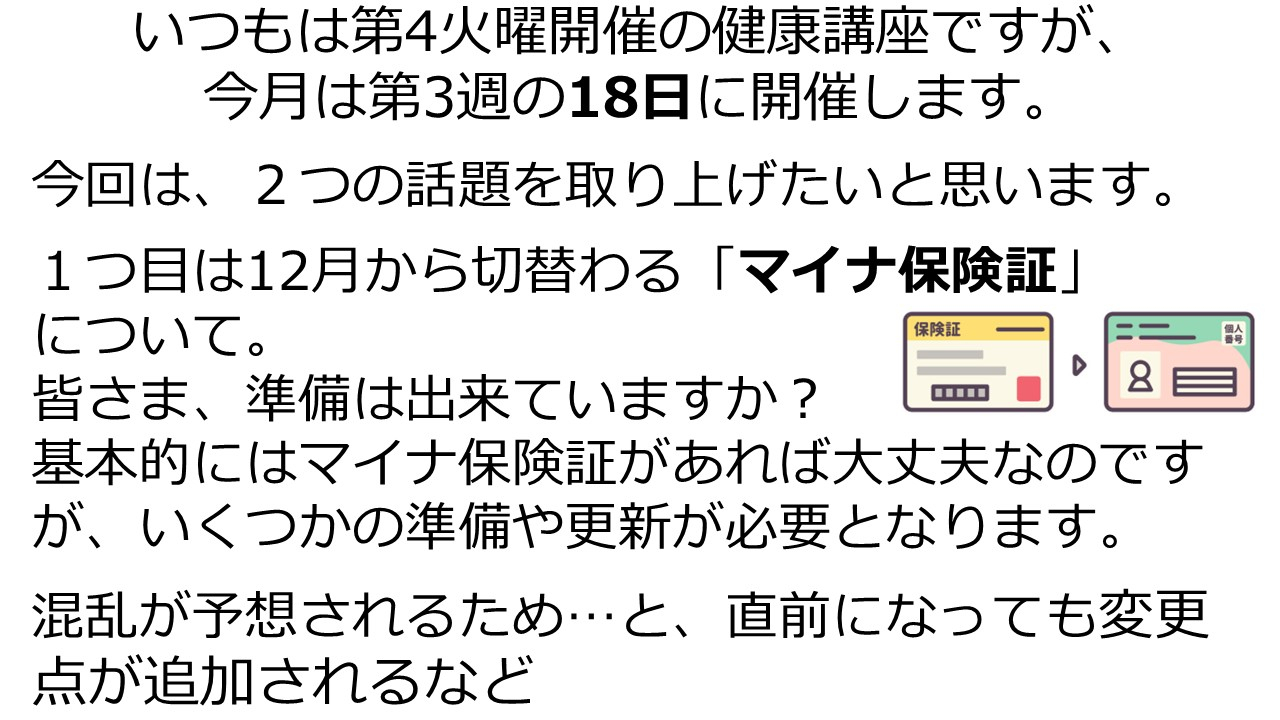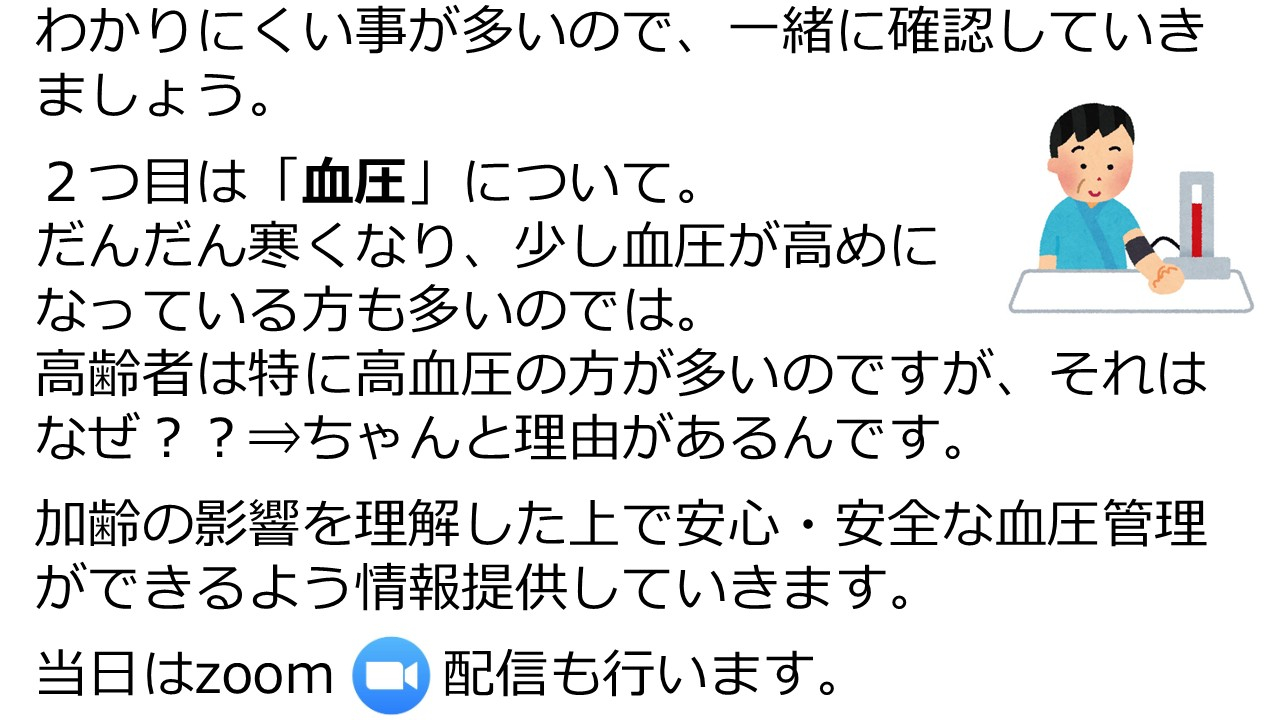 2025.11.14 お知らせ 今月は第3火曜開催です。 ~健康講座~ Tweet シェアする 前の記事 2025.11.21 お知らせ ハンドメイド教室 お正月飾り 次の記事 2025.11.09 お知らせ ちぎり絵教室参加者募集 一覧へ戻る