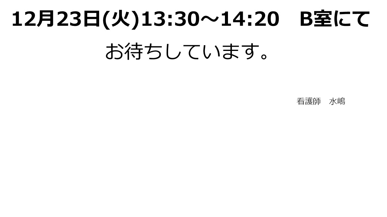 2025.12.22 お知らせ 年末年始を元気に過ごしましょう。 ~健康講座~ Tweet シェアする 前の記事 2026.01.05 お知らせ Let’s 脳トレ 「間違い探し」 次の記事 2025.12.19 お知らせ ハンドメイド教室 ~毛糸で作るクリスマスリース~ 一覧へ戻る