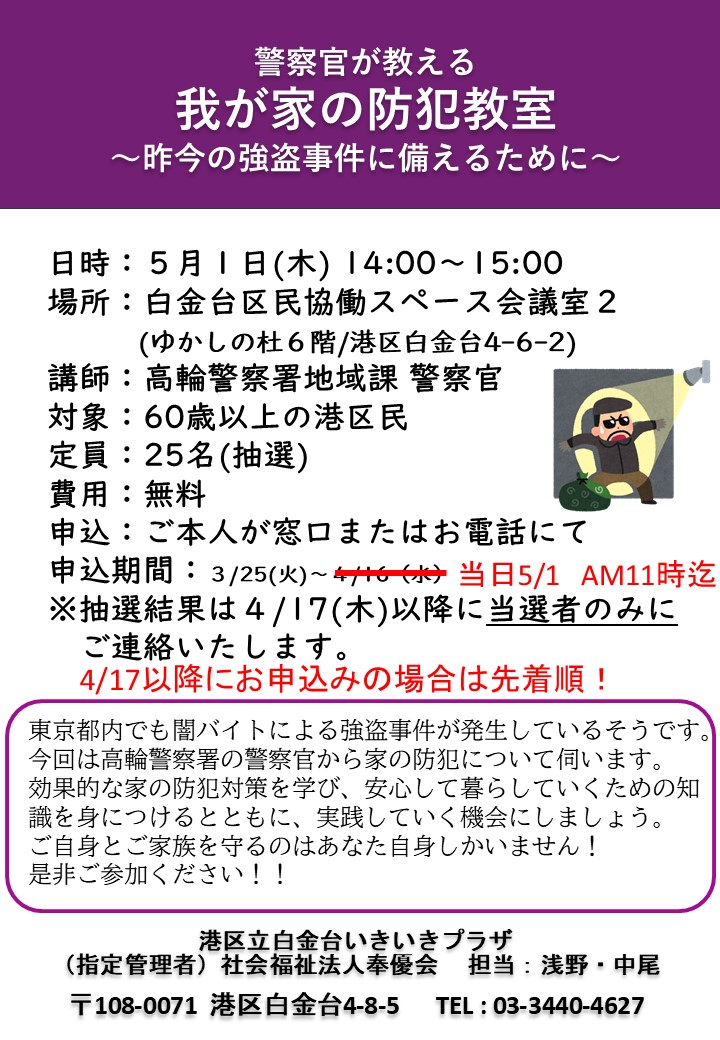 2025.04.29 活動報告 我が家の訪販教室 追加募集中! Tweet シェアする こんにちは!5月1日開催の『警察官が教える我が家の防犯教室』ですが、現在追加募集中です。是非いらしてください!! 白金台いきいきプラザ AS 前の記事 2025.04.30 活動報告 スマホ講座追加募集中 次の記事 2025.04.29 活動報告 花のしおり作り 申込受付中!! 一覧へ戻る