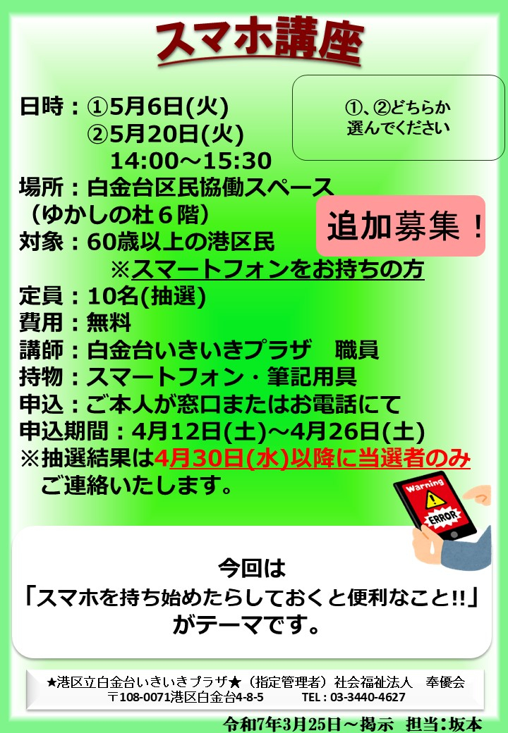 2025.04.30 お知らせ スマホ講座追加募集中 Tweet シェアする こんにちは 白金台いきいきプラザの坂本です♪ 5月6日と20日に開催のスマホ講座ですがまだ空きがあります!! ご興味あるかたは白金台へお申込みお待ちしてます♪ 白金台いきいきプラザ 坂本 前の記事 2025.04.30 お知らせ 健康情報 次の記事 2025.04.29 お知らせ 我が家の訪販教室 追加募集中! 一覧へ戻る