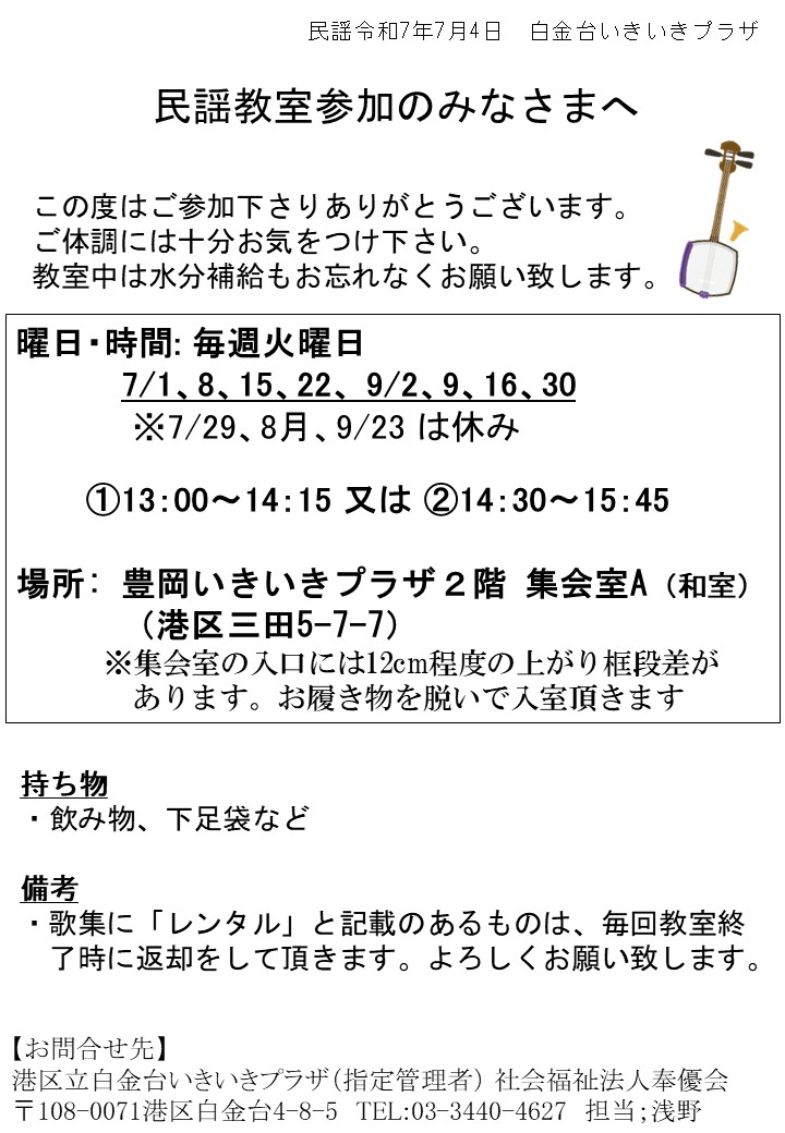 豊岡いきいきプラザの集会室Aで開催している民謡教室(7・9月期)ですが、