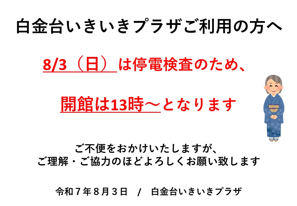 2025.08.03 お知らせ 8/3(日)は停電検査のため開館は13時〜となります Tweet シェアする 前の記事 2025.08.03 お知らせ 毎日9:20〜朝体操をしています! 次の記事 2025.08.01 お知らせ 民謡教室 8月は夏休みです♪ 一覧へ戻る