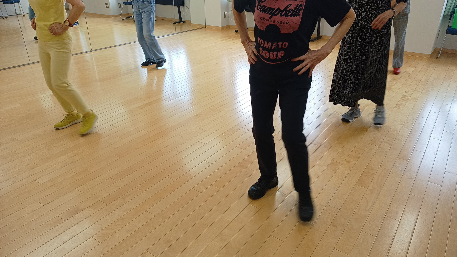 軽快なカントリーミュージックにあわせてステップを踏みます。ステップが上手に踏めると楽しくなります。火曜日は初心者向けのコースです。