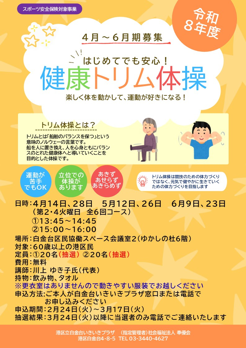 次回開催の4月~6月期の募集を行っています。3月17日まで申し込みを受け付けております。トリム体操にご興味をいただけましたらこの機会にお申し込みください。3月号の白金台だよりにも募集の概要が掲載されていますのでご参照ください。