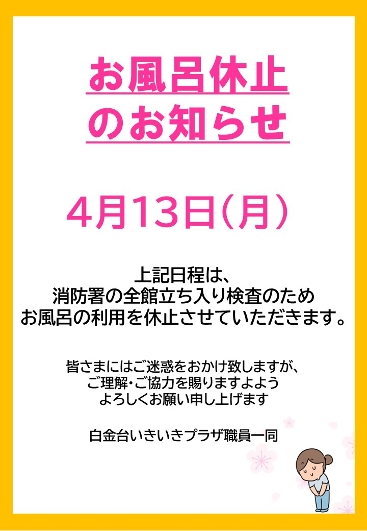 2026.04.06 お知らせ 【お知らせ】お風呂の休止について Tweet シェアする 現在、白金台いきいきプラザでは大規模改修工事を実施しております。 4月13日(月)は消防署の全館立ち入り検査のため、お風呂の利用を休止させていただきます。 皆さまにはご迷惑をおかけいたしますが、何卒ご理解とご協力を賜りますようお願い申し上げます。 一覧へ戻る