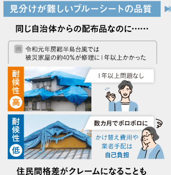 契約を締結した職員の言葉として「今回の協定を締結するにあたって、メーカーによってブルーシートの品質にかなりの違いがあることを初めて知りました」とあり、「品質の差によって、劣化スピードに大きく違いが出る」ということのようです。以下、リンク先本文中から一部転載した写真ですが品質の悪いシートは数カ月でボロボロになってしまったようです。
