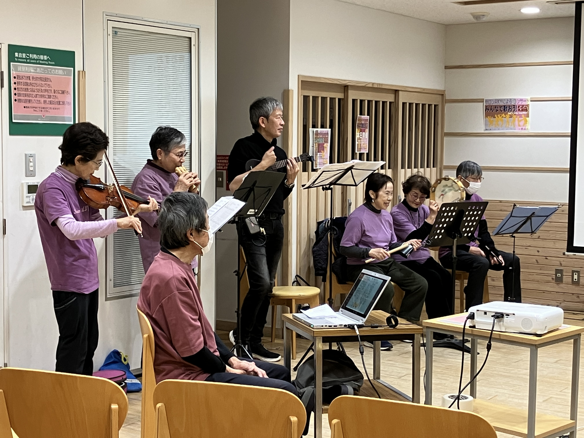 出演者の方は総勢14名。下の写真は、当日開始時間前の入念なリハーサルの風景です。ヴァイオリン、オカリナ(のような楽器)、ウクレレ、パーカッション、タンバリン・・・