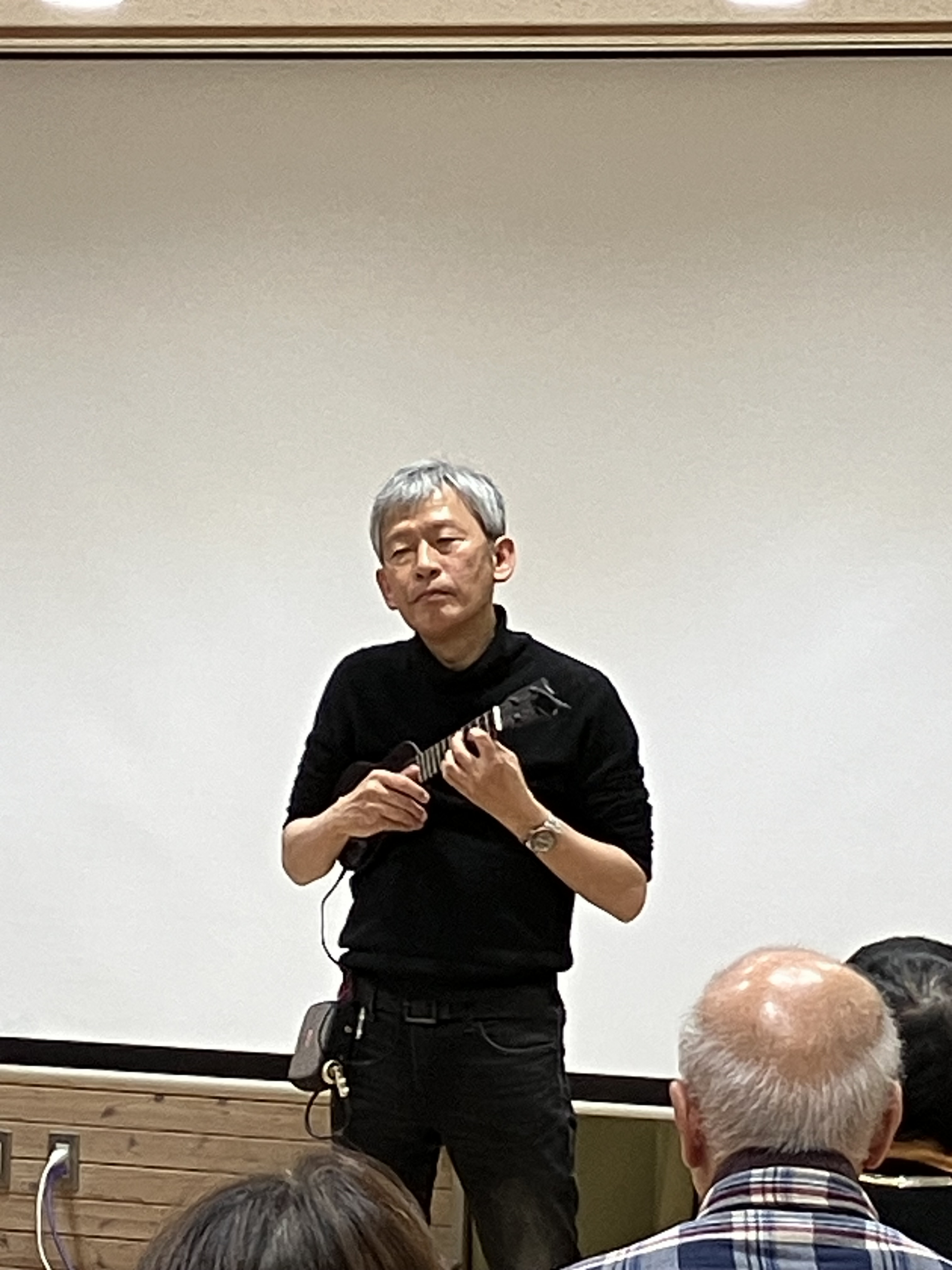 途中でウクレレのソロ演奏。写真ではちょっとわかりづらいですが、普通のウクレレよりかなり薄く持ち運び易そうなウクレレです。腰に小型のアンプを付けて演奏されます。ハワイアンな、とても心地よい音が広がりました。1曲披露していただきましたが、「この曲は3か月で弾けるようになりました。」とのことでした。
