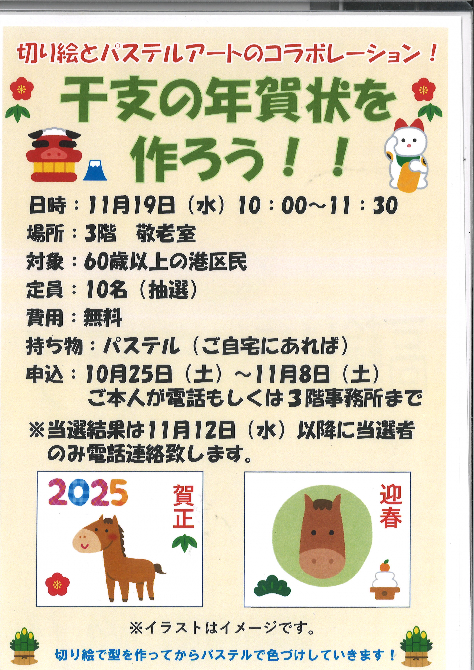 2025.11.07 お知らせ 干支の年賀状を作ろう Tweet シェアする 前の記事 2025.11.07 お知らせ さわやか体育祭開催 次の記事 2025.11.07 お知らせ 歩こう会 一覧へ戻る
