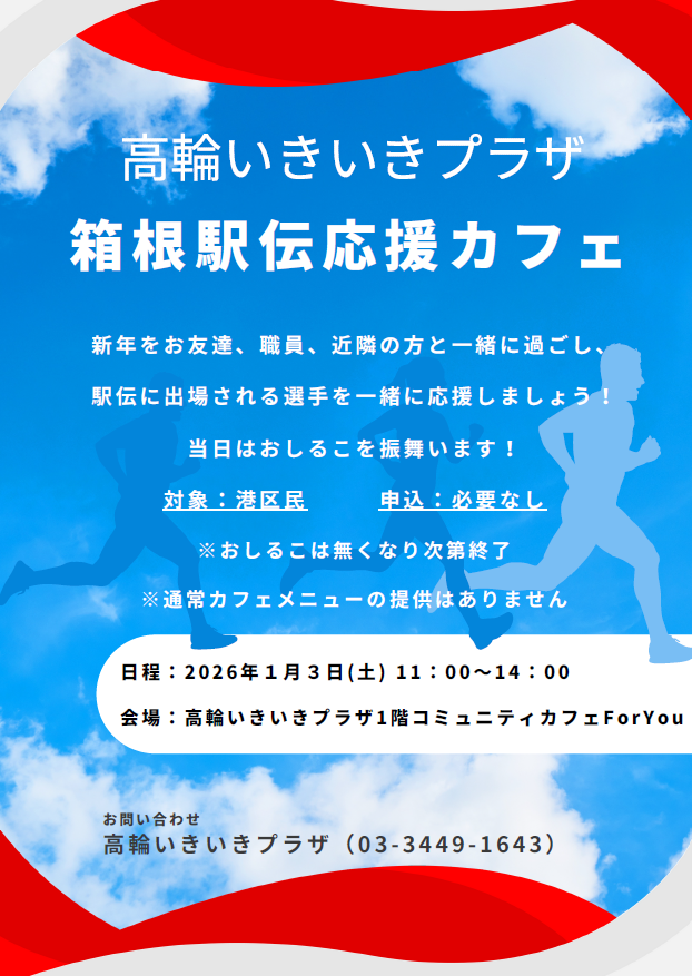 2025.12.25 お知らせ 箱根駅伝応援 Tweet シェアする 2026年1月3日(土)11時~14時、箱根駅伝応援カフェを開催します! 家族や友人、地域の方と一緒に駅伝に出場させれる選手を応援しませんか。 モニター中継し、13時半頃に品川駅沿いの第一京浜大通りまでみんなで向かい、 間近で選手を見て応援します。 港区民であればどなたでもお越しいただけます。 無料で温かいおしるこもご用意しております。 *無くなり次第終了 是非、お越しくださいませ。 高輪いきいきプラザ 一覧へ戻る