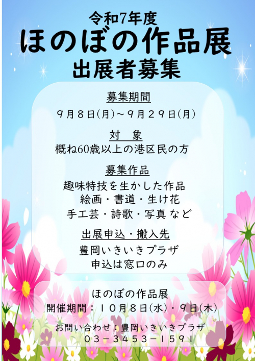 2025.09.23 〇ほのぼの作品展出展者募集中〇 お知らせ #豊岡いきいきプラザ #お知らせ #ほのぼの作品展 2024.10.06 〇フラダンス教室 日程変更のお知らせ〇 お知らせ #豊岡いきいきプラザ #お知らせ #フラダンス教室 2024.09.14 〇各講座 お申込み受付中〇 お知らせ #豊岡いきいきプラザ #豊岡だより #お知らせ #イベント #9月イベント