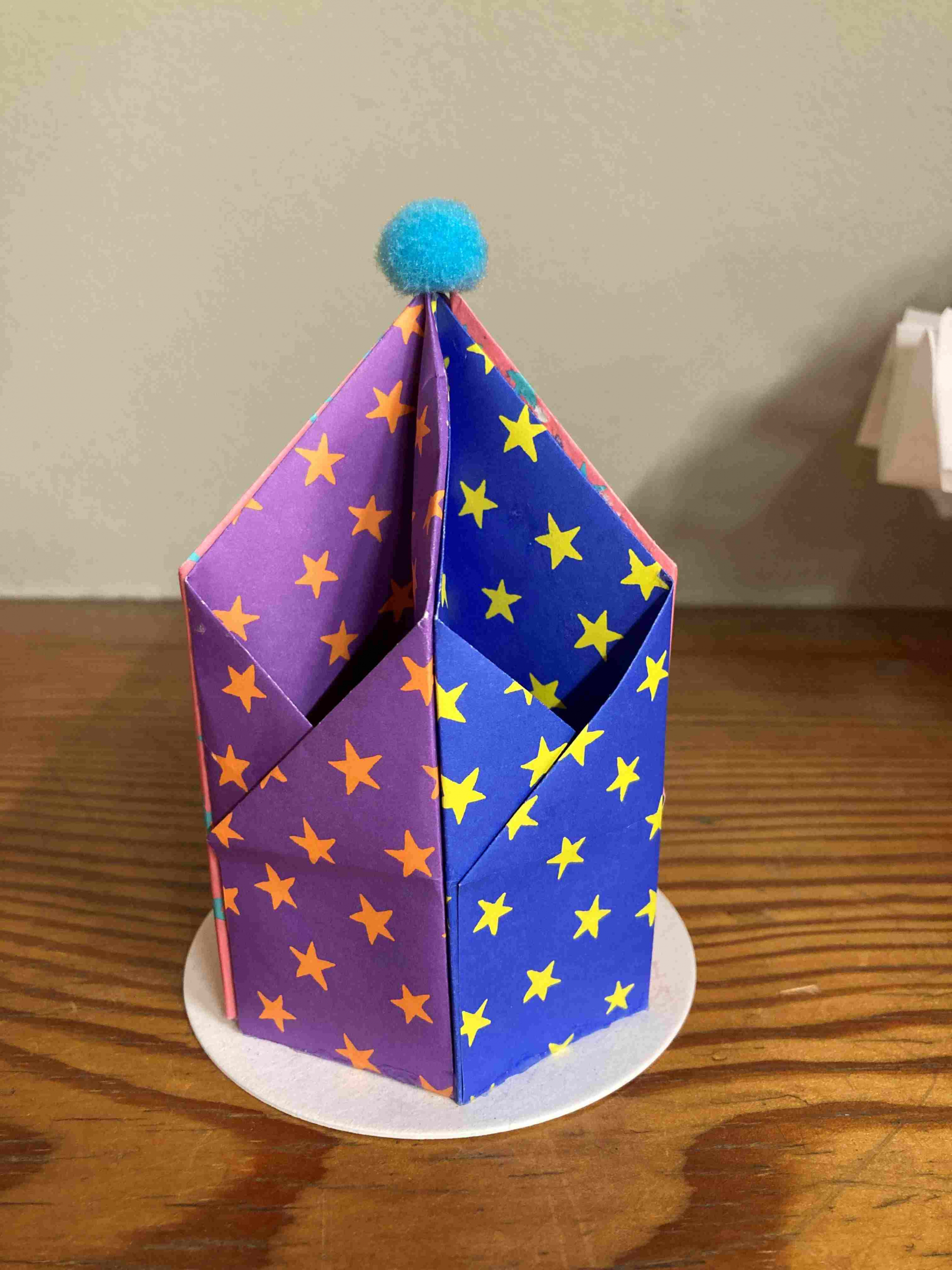 6つの三角柱を作り、それを好みの色に並べて、糊付けします。