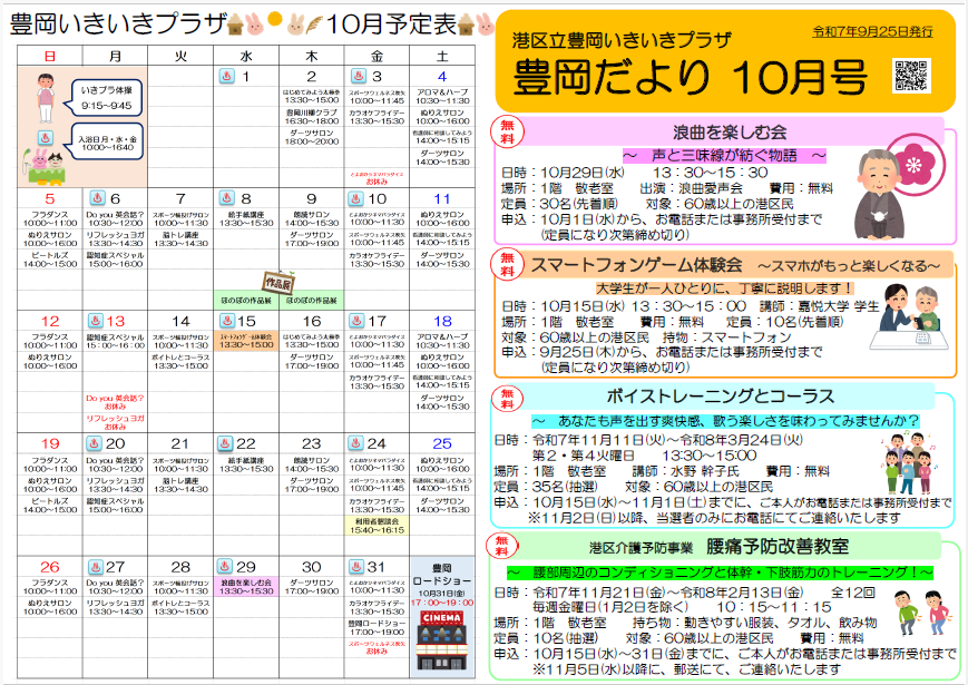 2025.09.25 お知らせ 〇豊岡だより10月号〇 Tweet シェアする おはようございます。 毎月25日は豊岡だより発行の日です! 今月もたくさんのイベントをご用意しております。 早速お申込みが開始する講座もございますので、是非チェックしてみてくださいね。 #豊岡いきいきプラザ #豊岡だより10月号 前の記事 2025.09.25 お知らせ ○9月もラストスパート!○ 次の記事 2025.09.24 お知らせ 〇今日のいきプラは〇 一覧へ戻る