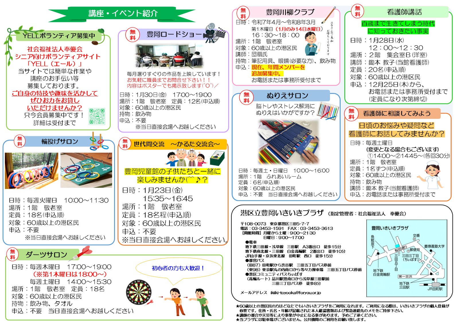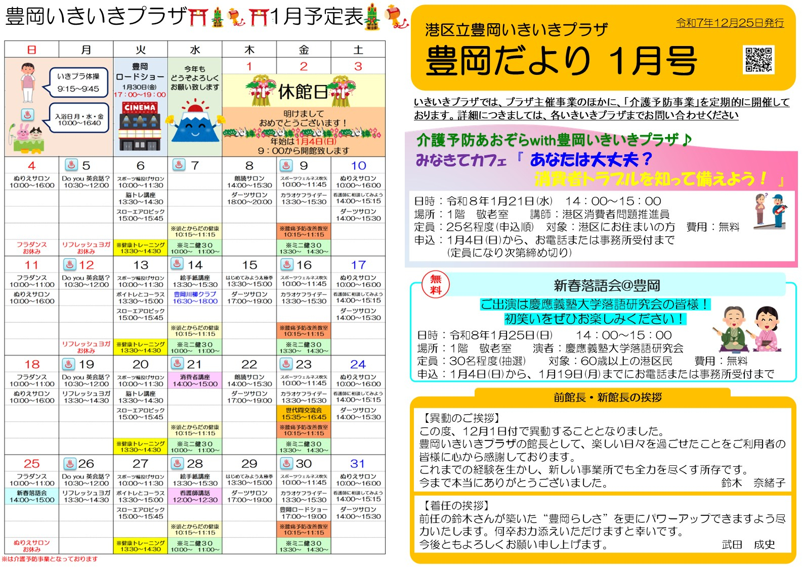 2025.12.25 お知らせ ★豊岡だより1月号★ Tweet シェアする おはようございます。 今日はクリスマス! そして、『豊岡だより』1月号の発行日です。 今回も楽しい講座とイベントが盛りだくさんです。どうぞご覧ください! 豊岡いきいきプラザMO #豊岡だより1月号 #豊岡いきいきプラザ 前の記事 2025.12.25 お知らせ ○Y職員日記○ 次の記事 2025.12.24 お知らせ クリスマスジャズコンサート 一覧へ戻る