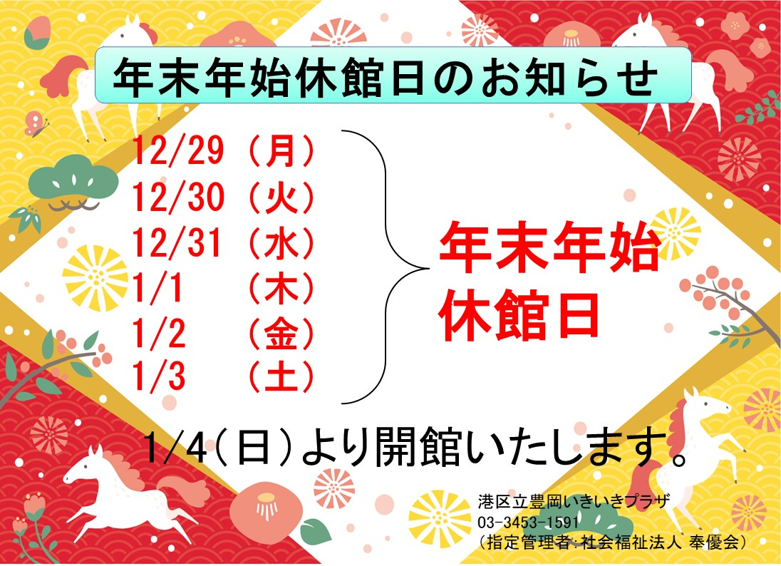 豊岡いきいきプラザは、12月29日(月)~1月3日(土)まで休館いたします。