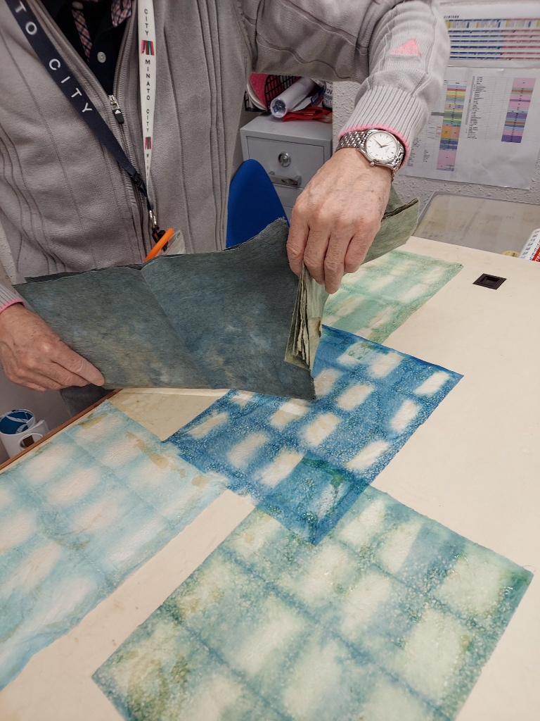 破れやシミがうまく隠れるように、色付きの和紙をコラージュ。工夫次第で手軽に、そして素敵に修理できるんですね!自宅でも真似できそうですよ。