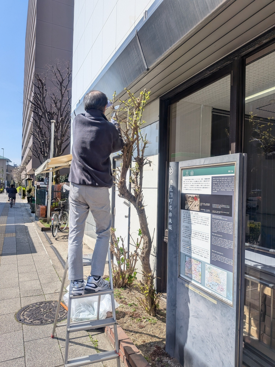 昨日の冷たい雨から一転し、今日の東京地方はしっかりとした陽射しで青空がキレイです。そんな春の陽射しを受けながら、H職員が何やら外で作業を開始!