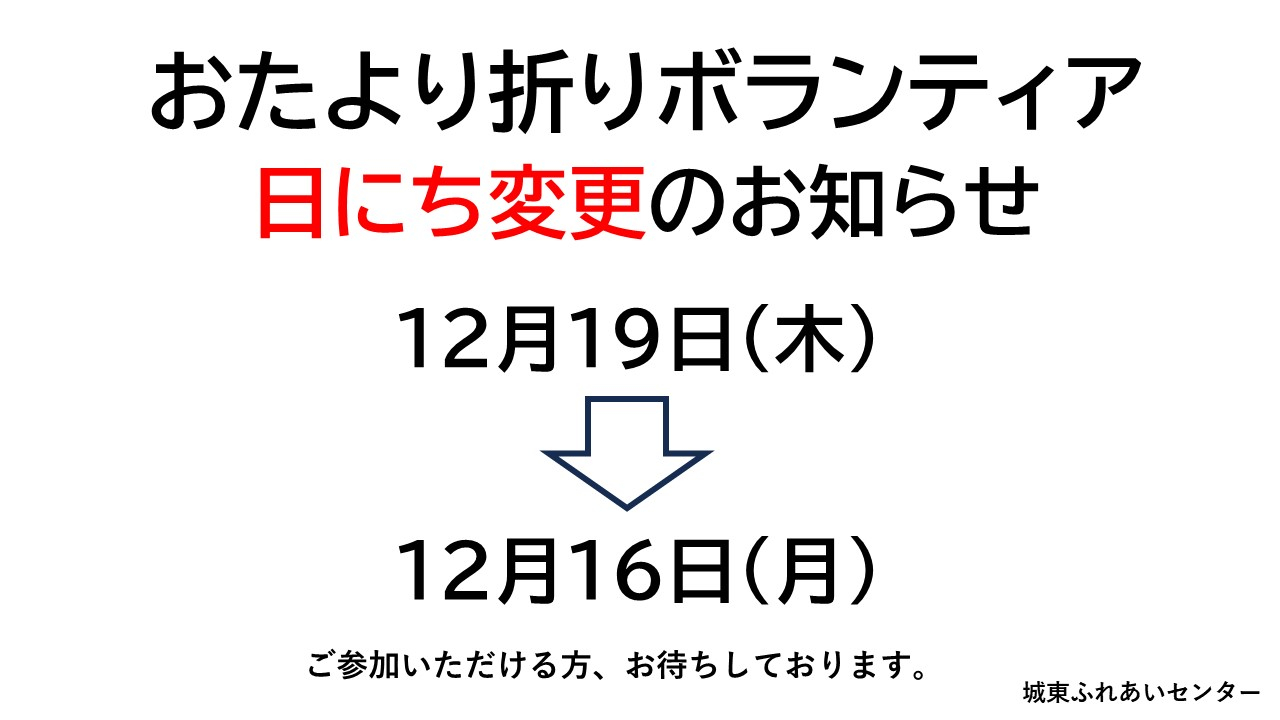 今月の【おたより折りボランティア】ですが、発行日が12月23日(月)のため、いつもより早い開催となります。