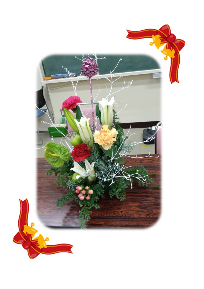 先生から花材と生け方の説明を聞いた後、アレンジ開始。皆さんの個性が光るアレンジに、先生が丁寧に一人一人にアドバイス。お互いに他の方の生け方を見て参考にしたり、先生がどんなアドバイスをするかに耳を傾けたり、クリスマス気分先取りの、楽しく充実した一時でした。