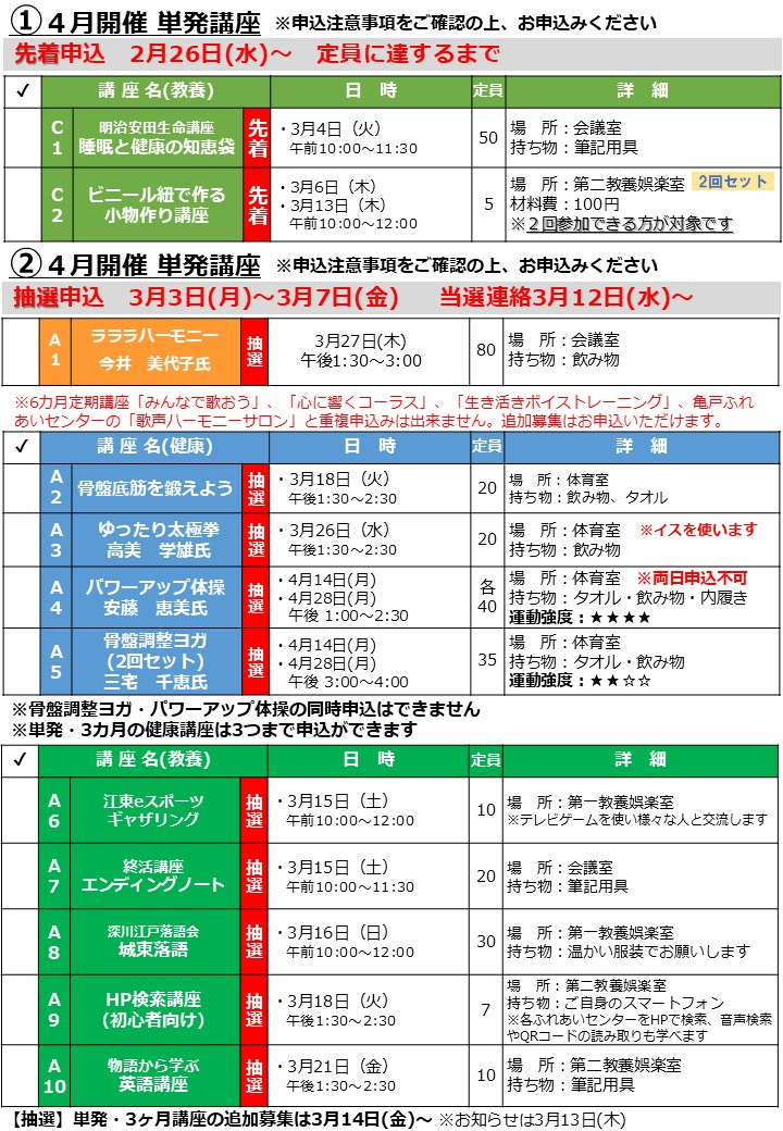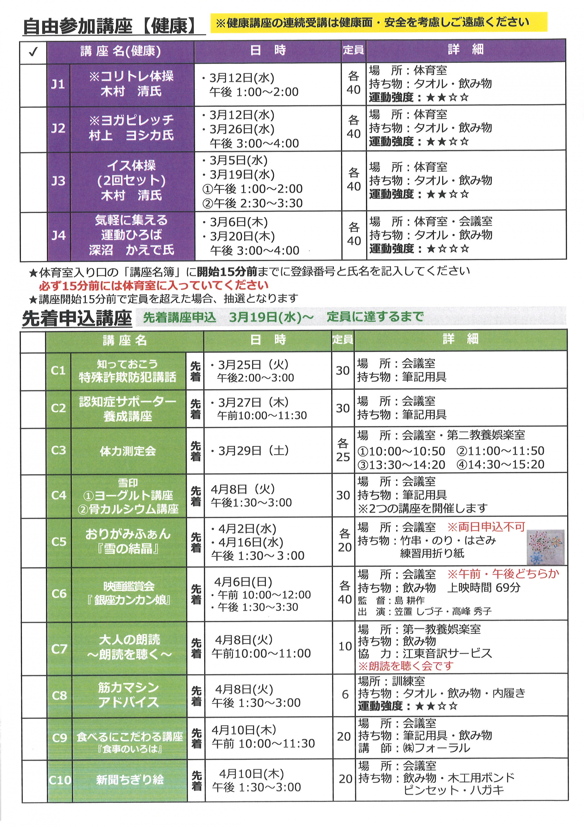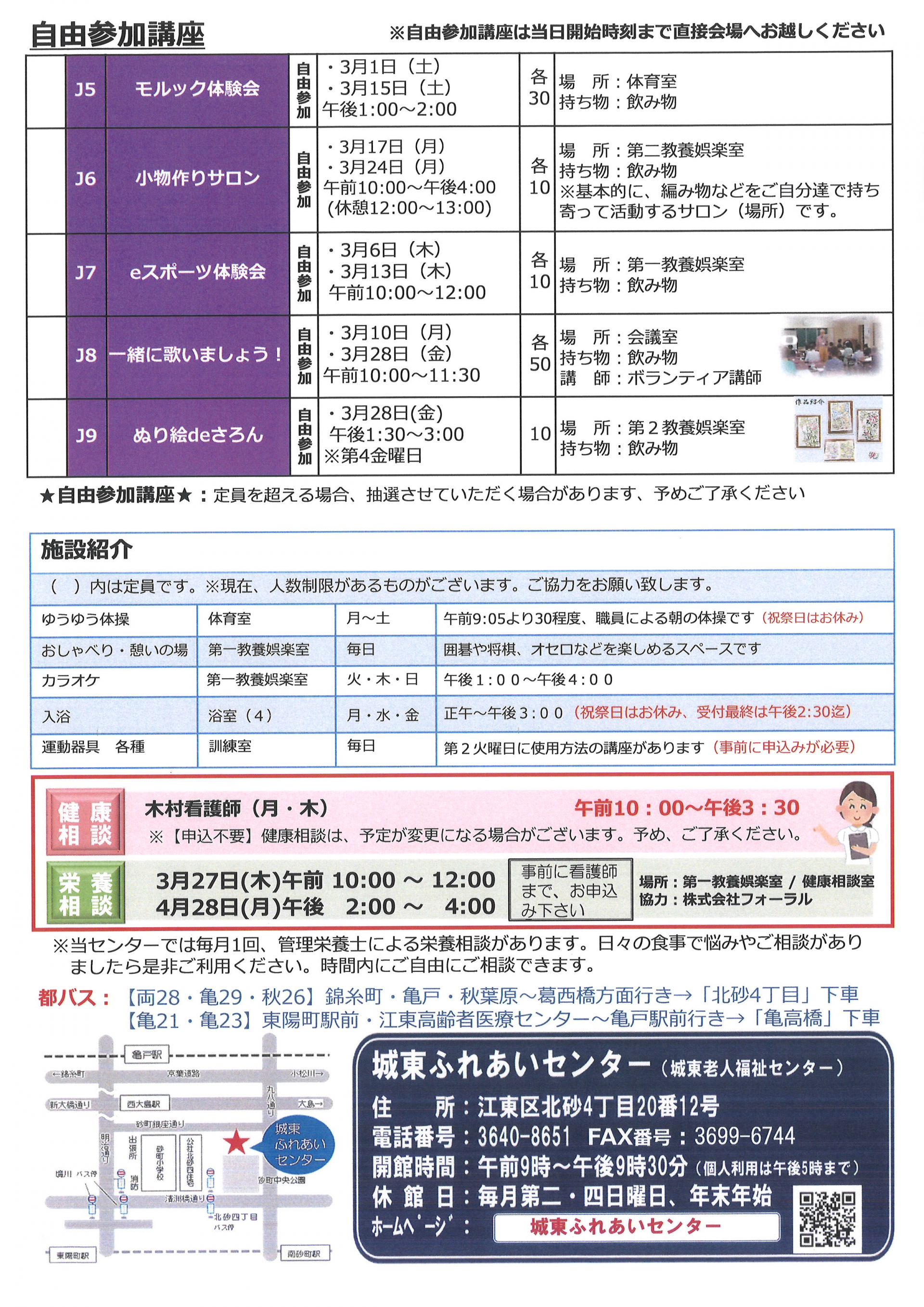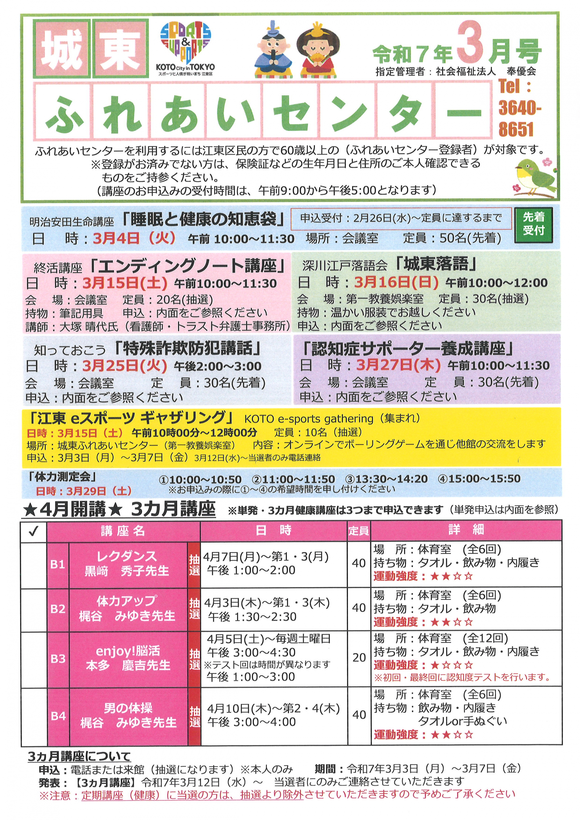 2025.03.01 お知らせ 城東ふれあいセンター おたより3月号 Tweet シェアする 皆さまこんにちは(^^♪ 城東ふれあいセンターおたより3月号が完成しました! 様々な講座が開催予定ですのでご確認下さい 城東ふれあいセンター YR 前の記事 2025.03.01 お知らせ トキメク折り紙 次の記事 2025.02.25 お知らせ 初心者のための大人の鍵盤ハーモニカ【ミニコンサート】のお知らせ 一覧へ戻る