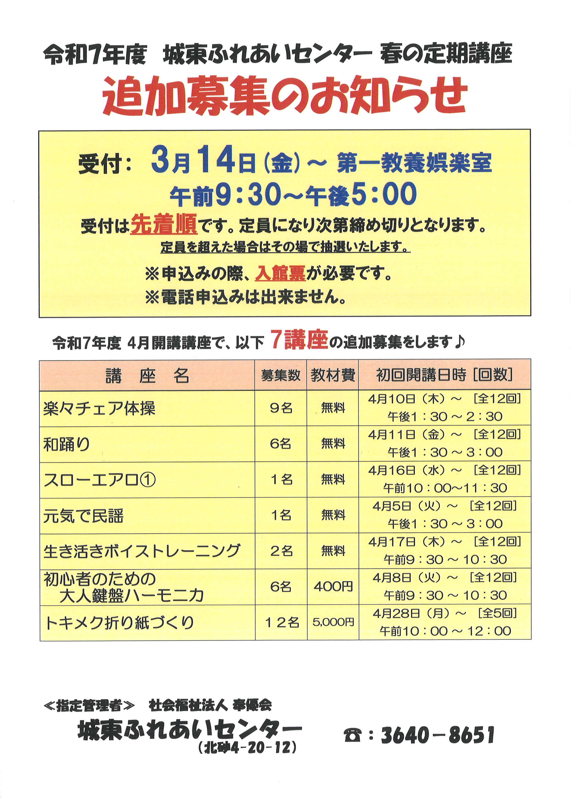 4月から開講いたします、春の定期講座の追加募集のご案内です。