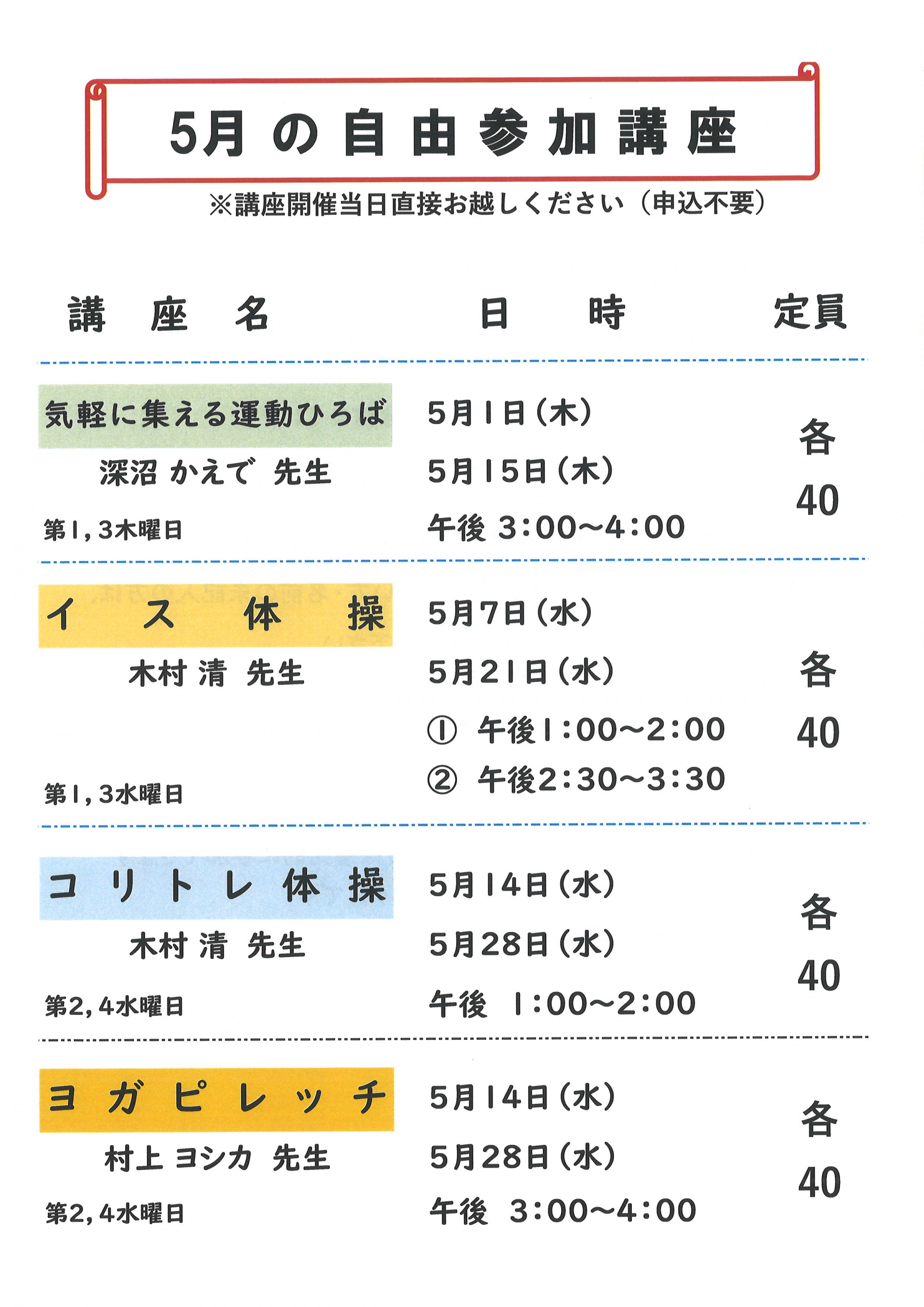 2025.04.22 お知らせ 5月開催、自由参加講座のお知らせ Tweet シェアする 5月の自由参加講座の日程です。注意事項もご一緒にご確認ください。皆さんのご参加、お待ちしております(*^▽^*) 城東ふれあいセンター Y.R 前の記事 2025.04.25 お知らせ 城東ふれあいセンター おたより5月号 次の記事 2025.04.21 お知らせ 明治食育講座~カラダは食べ物からできている~ 一覧へ戻る
