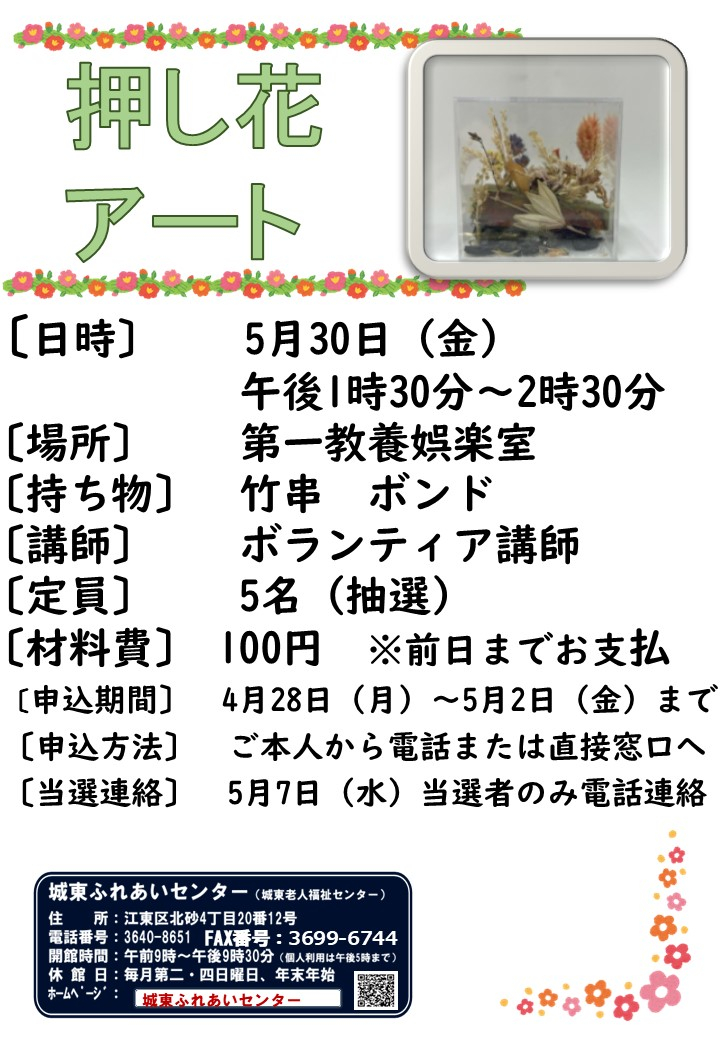 2025.04.25 お知らせ 押し花アート Tweet シェアする 5月30日開催する押し花アートの内容をお知らせします。 じゃじゃん!!『クリアボックス』 上記をご確認のうえ、みなさんの申込み、どしどしお待ちしております(*^▽^*) 城東ふれあいセンターKC 前の記事 2025.04.30 お知らせ モルック体験会!! 次の記事 2025.04.25 お知らせ 城東ふれあいセンター 予定表5月号 一覧へ戻る