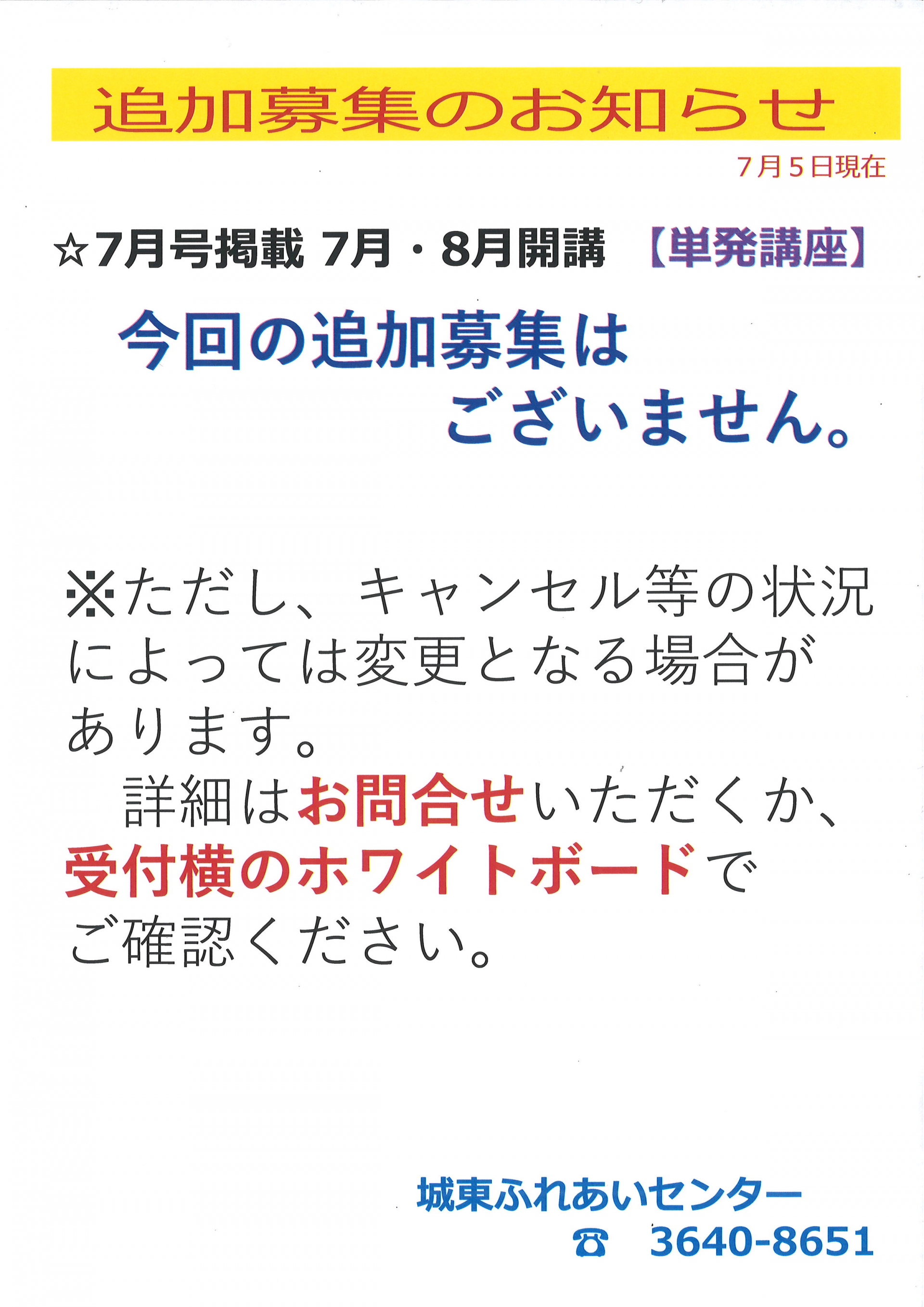 7月号掲載 7月・8月開催 単発講座の追加募集のお知らせです。